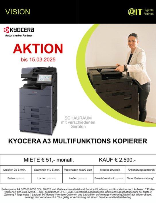 Als autorisierter Kyocera-Partner wissen wir bei PIT IT GmbH, wie wichtig zuverlässige Druck- und Kopierlösungen für den reibungslosen Arbeitsalltag sind. Deshalb freuen wir uns, Ihnen diese zeitlich begrenzte Aktion präsentieren zu können: den Kyocera A3 Multifunktionskopierer zu attraktiven Konditionen – erhältlich bis zum 15. März 2025.